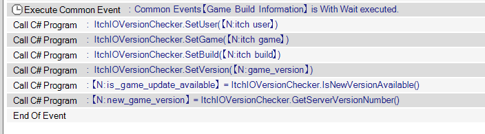 - 理想的には、"Game Build Information "という文字列変数ボックスを定義するためだけのコモンイベントを別に作り、更新チェックを行うコモンイベントの中でそれを呼び出す価値がある。
