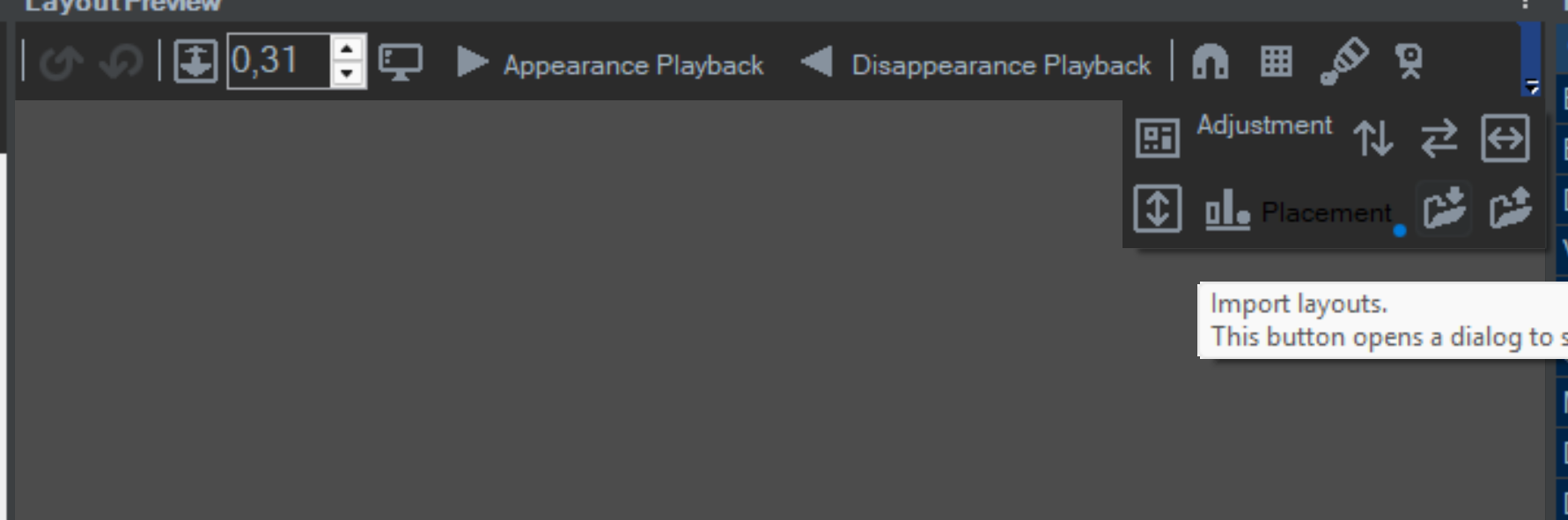 Next, go to the Layout tool, open the Free Layouts, and then import the file "ButtonIconsLayout.lyrbr" by pressing the folder with an arrow going down icon. The import button might be hidden by a small arrow, so click it to reveal the rest of the top bar icons.